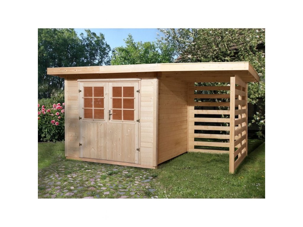 Uzavřená část je vhodná pro uskladnění zahradního nářadí, techniky, kol nebo sezónního vybavení. Boční přístřešek lze využít například jako dřevník, prostor pro zahradní nábytek, popelnice nebo jízdní kola. Díky pultové střeše a otevřené konstrukci přístřešku je zajištěna dobrá ochrana před deštěm a zároveň snadný přístup.