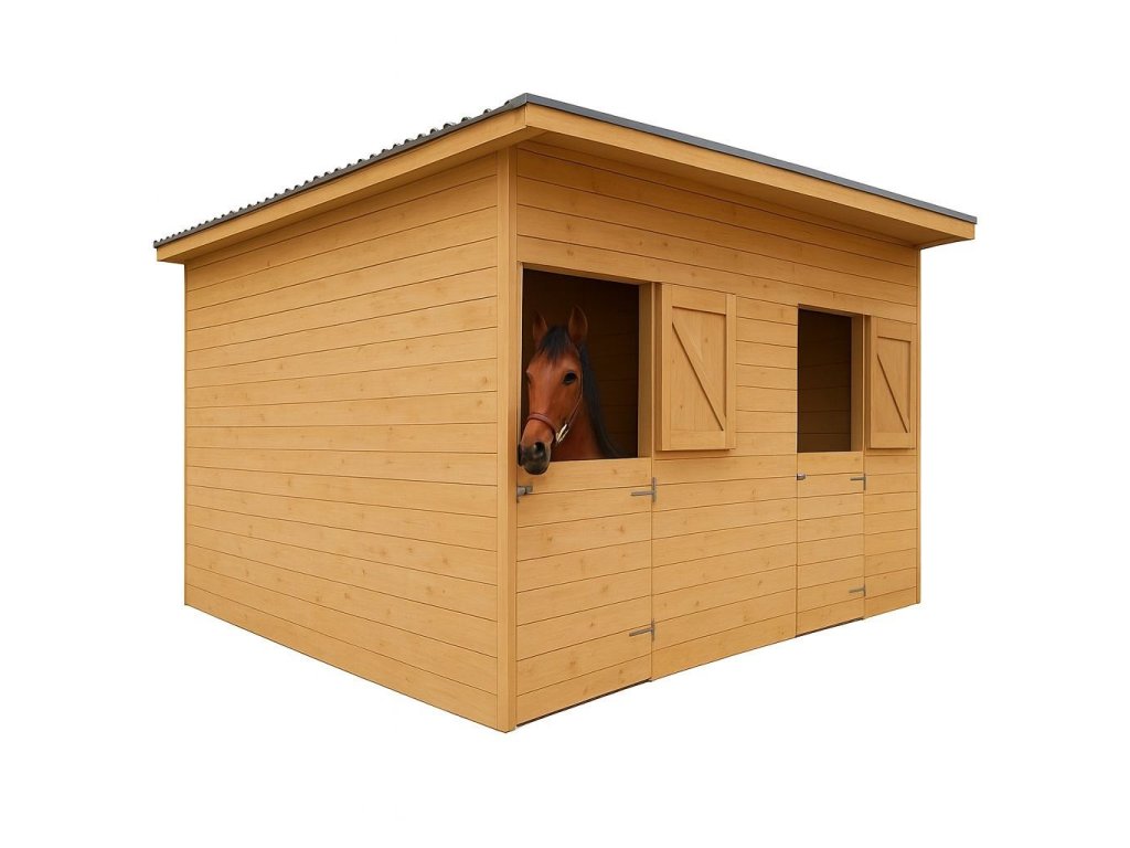 Praktická a prostorná stáj pro ustájení dvou koní. Je opatřena sedlovou střechou s přesahem 20 cm z každé strany. Díky promyšlenému designu poskytuje dostatek prostoru i komfortu a lze ji přizpůsobit individuálním potřebám koní i konkrétním podmínkám na pozemku.